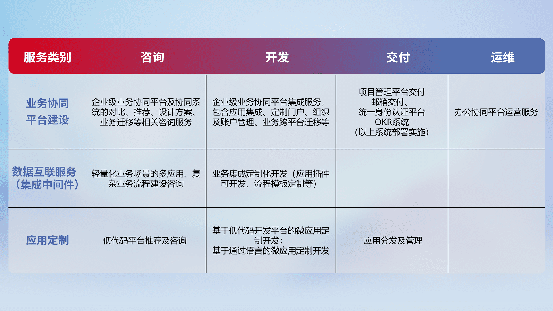 针对钉钉、、企微、、、IDaas等平台级产品提供产品的规划、、方案、、、、交付、、定制化开发等服务,,,,实现如统一协同办公、、智能客户服务、、、混合会议管理、、、智能数据查询、、、、等业务场景,,实现数字化转型。。