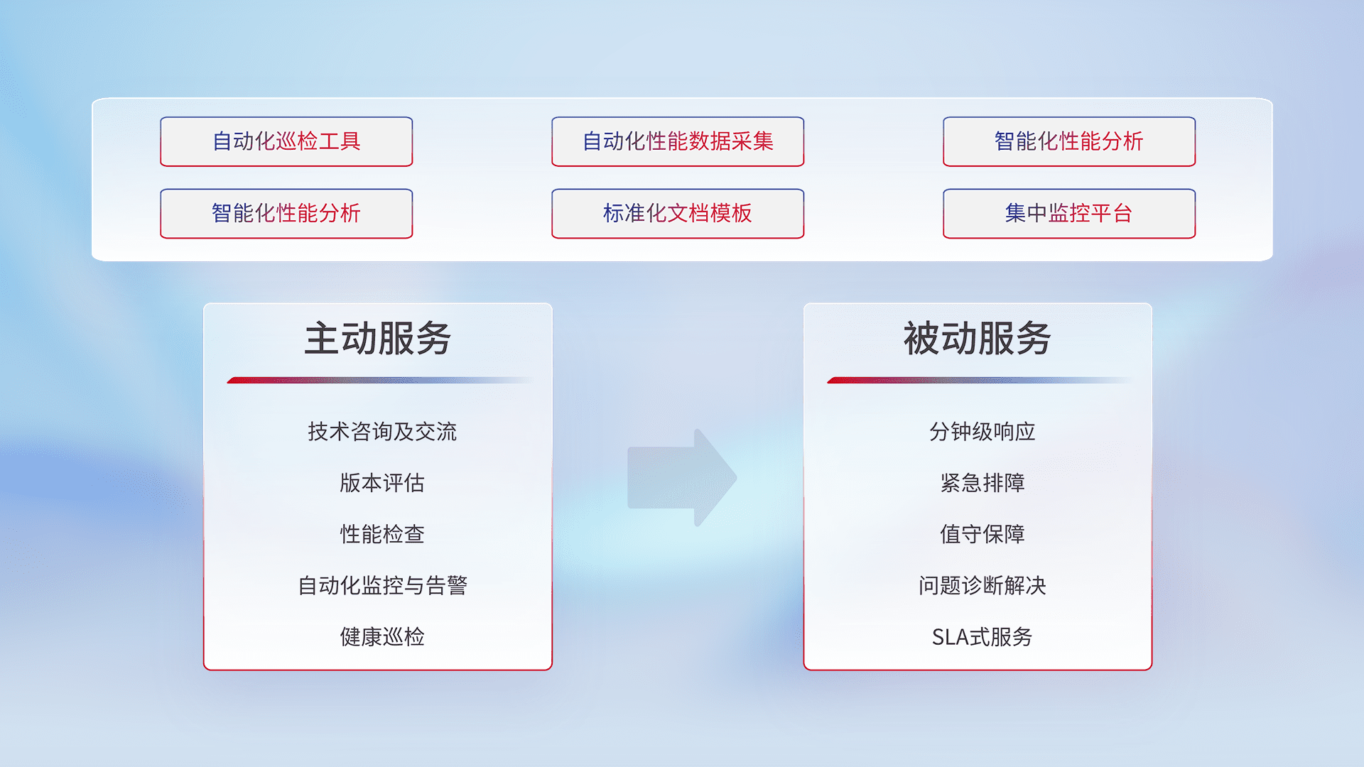智能化工具和标准化文档,,保障服务质量,,,提供主动服务(包含技术咨询、、、、版本评估、、性能检查、、自动化监控与告警、、、健康巡检)和被动服务包含(分钟级响应、、紧急排障、、、值守保障、、、、问题诊断解决、、、SLA服务)。。